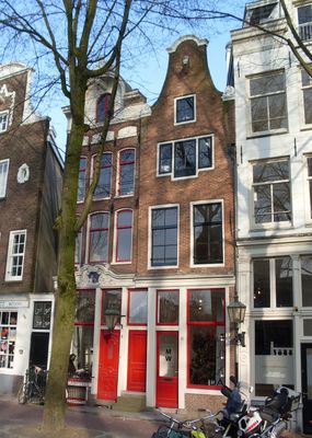 Huis met gevel op houten pui met rijk gesneden puibalk