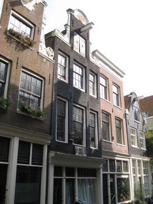 Huis met latere gevels, voorzien van een karakteristieke zeer hoge houten pui en een klok vormige top onder rollagen