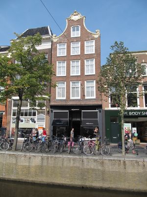 Pand met grote verdiepingshoogte en in de dammen tussen de vensters op de verdieping overkragingen op geornamenteerde lijst