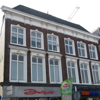 Pand met twee verdiepingen met rechte kroonlijst waarop vier paren consoles