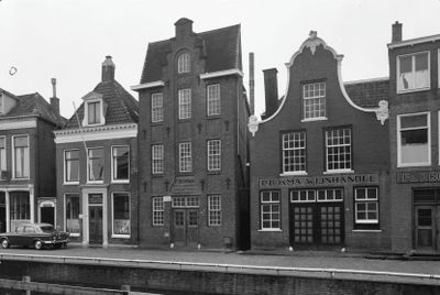 Pand met geblokte en versierde kroonlijst onder dwarskap tussen topgevels