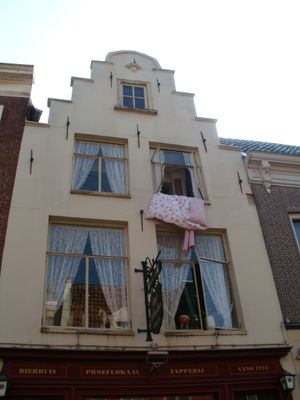 Eenvoudig pand met verdiepingen en zolderverdieping ontstaan uit verbreding van de oorspronkelijke topgevel