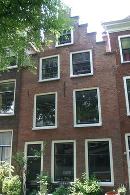 Pand met tuitgevel. Kleine roeden en schuiframen