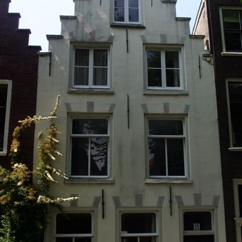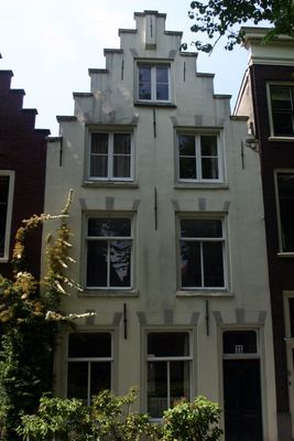 Pand met tuitgevel. Kleine roeden en schuiframen