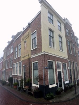 Hoekpand Havenplein. Brede bakstenen lijstgevel. Fraai uithangteken van de voormalige apotheek de "Blauwe Arend".