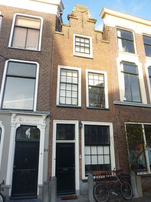 Pand met geverfde tuitgevel. Hardstenen stoep en palen. Later gewijzigd