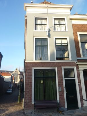 Hoekpand Vliet. Gepleisterd en geverfde bakstenen gevel met rechte kroonlijst