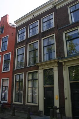 Pand met gevel met rechte kroonlijst met consoles. Deuromlijsting en deur Lod. XVI. Zijgevel aan het Levendaal