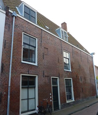 Pand met gepleisterde lijstgevel, zijwand aan de Molensteeg met restanten van vensterbogen en in lichtkleurige baksteen gemetselde Davidster