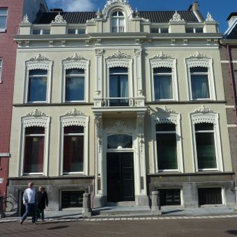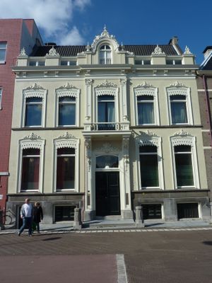 Pand met gevel op hardstenen plint, hardstenen stoep-toepassing van drie pilasterorden boven elkaar - middenpartij met drie traveeën gedekt door een driehoekig fronton met wapenschilden