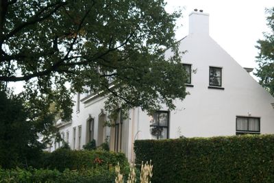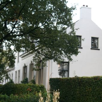 Complex van drie woningen, witgepleisterd. Linkergedeelte onder zadeldak, middengedeelte en rechtervleugel schilddak