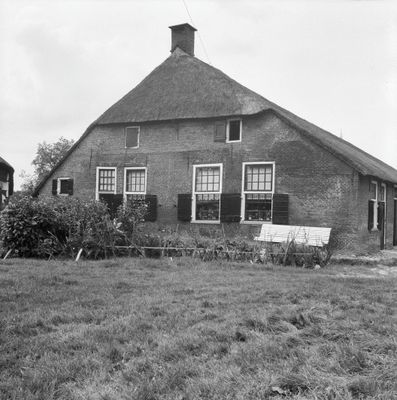 Boerderij van het zijlangsdeeltype met dwarsgeplaatst woonhuis onder rieten schilddak en schuurdeel onder afgewolfd rietgedekt schilddak