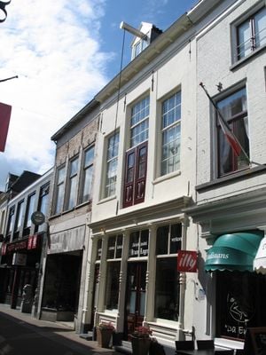 Pand met gepleisterde lijstgevel en jongere winkelpui en met restanten van de middeleeuwse stadsmuur