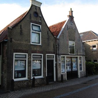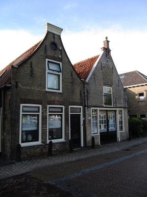 Rechts een pand met puntgevel waarin een zoldervenster met ontlastingsboog. Links een pand met puntgevel, versierd met vlechtingen en geblokte ontlastingsbogen