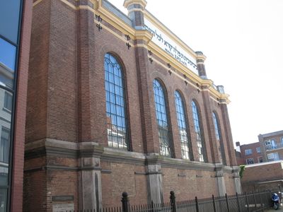De synagoge vertoont traditionele religieuze architectuur met sierlijke decoraties en glas-in-loodramen kenmerkend voor religieuze gebouwen uit de 19e eeuw.