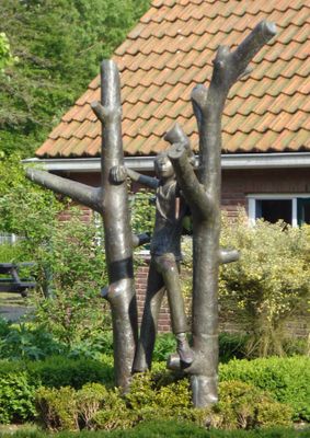 Jongen in boom, publiek kunstwerk door Dick Loef in Den Haag, Nederland