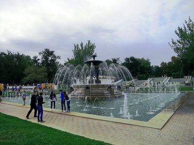 De fontein, gebouwd in 1936, vertegenwoordigt de architectonische ontwikkelingen van de sovjetstedenbouw.