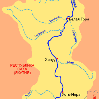 De Bolschaja-Momskaja-Aufeis vormt een dikke rivierjslaag die zich over 30 kilometer uitstrekt door het Momsky District van de Republiek Sakha.