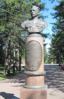 Het bronzen standbeeld staat centraal op het Karlutskaya plein ter herdenking van Yevgeny Kungurtsev, tweevoudig Held van de Sovjet-Unie.