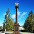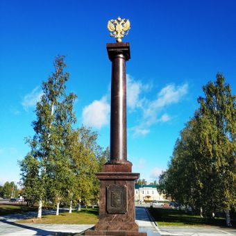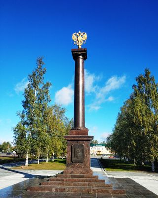 Het graniet en bronzen monument bereikt een hoogte van 11,8 meter, met neoclassicistische architectuurelementen in het centrum van Petrozavodsk.