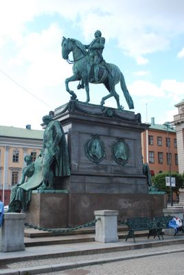 Het beeld toont Koning Gustav II Adolf te paard, gekleed in militair harnas met een geheven zwaard in zijn hand.