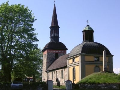 De stenen structuur van de Lovö Kerk heeft een smal ontwerp met oostelijke uitbreidingen en bevat een heiligdom voltooid in de 17e eeuw.