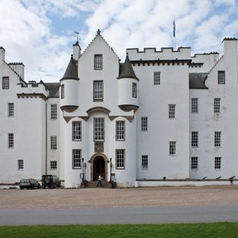 Blair Castle is een landhuis in Blair Atholl, Perth and Kinross, Schotland, dat opvalt door zijn lichte stenen muren en torens in de landelijke omgeving. Het gebouw combineert middeleeuwse torenresten met latere toevoegingen in Georgische en Victoriaanse stijl, zichtbaar in de onregelmatige daklijn en wisselende raamhoogtes.