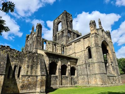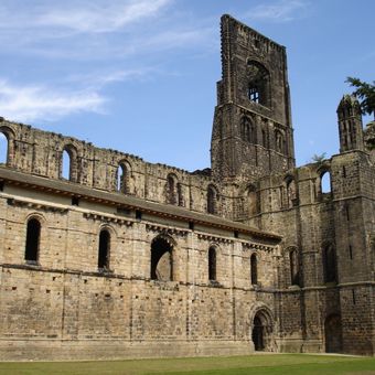Kirkstall Abbey is een cisterciënzerklooster in Leeds met ruïnes die zich over meerdere hectares uitstrekken. Je ziet nog intacte bogen, kamers en een centrale binnenplaats omgeven door de resten van religieuze gebouwen.