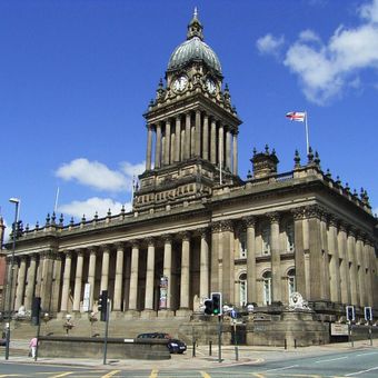 Het stadhuis van Leeds heeft Korinthische zuilen bij de ingang en een klokkentoren die boven de gebouwen van het centrum uitsteekt.
