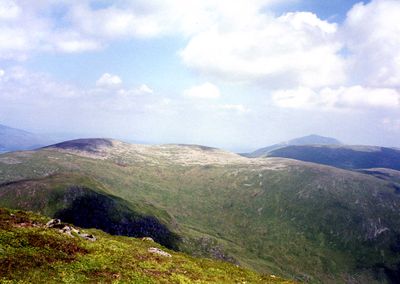 Meall Garbh reikt tot 968 meter met meerdere bulten langs de topkam, gemarkeerd door ijzeren palen rond een centrale steenhoop.