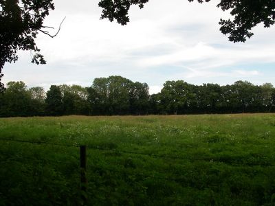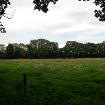 Het terrein fungeert als weiland binnen Folds Farm, met toegankelijke wandelpaden door met bomen omzoomde aardwerken en bosgebieden.
