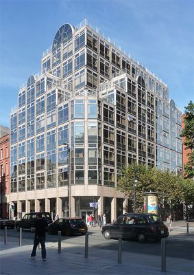 De glazen gevel van het gebouw markeerde een afwijking van traditionele bakstenen gebouwen in het Manchester van de jaren 1980.