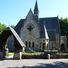 Het kerkgebouw vertoont neogotische architectuur met een opvallende klokkentoren, spitsbogen en gedetailleerde glas-in-loodramen in de structuur.