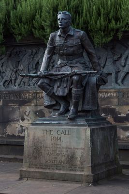 Het bronzen monument toont een soldaat in kilt gericht naar Castle Rock met een fries van mannen die een doedelzakband volgen.