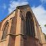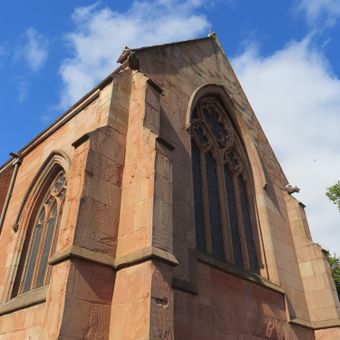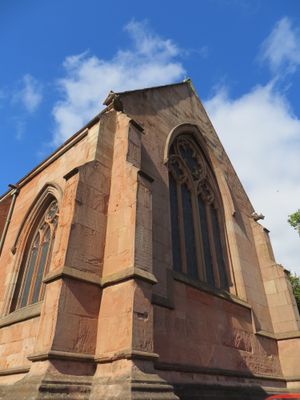 De Sint-Leonarduskerk vertoont Engels-gotische architectuur met ronde pilaren, spitsbogen en een driedelige toren gebouwd van lokale rode Bunter zandsteen.