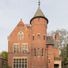 Het Tower House toont rode bakstenen muren, decoraties van Bath-steen, groene dakleien uit Cumbria en een cilindrische toren met kegelvormig dak.