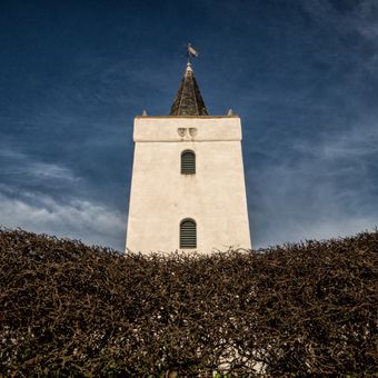 De stenen kerk met T-vormige plattegrond staat op een hoofdkruispunt achter het oorlogsmonument van het dorp.