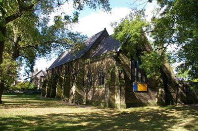 De Heilige Drievuldigheidskerk vertoont bewerkte zandstenen muren met natuurstenen versieringen en Welsh leien daken.