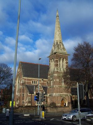 De kerk van rode zandsteen heeft witte kalkstenen banden en staat op de kruising van Trinity Road en Birchfield Road.
