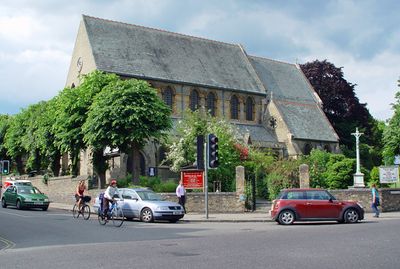 De Sint-Egidiuskerk staat op de kruising van Castle Street en Chesterton Road, met verticale architectonische elementen en ornamentele details.