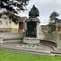 Het monument toont een centrale bronzen figuur die Naastenliefde voorstelt en twee kinderen omarmt, met granieten muren en banken.