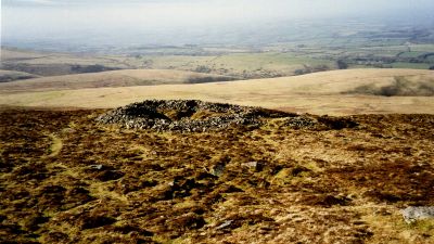 Round cairn and shelter 140m north west of Yes Tor summit, round cairn in Okehampton Hamlets, West Devon, England, UK