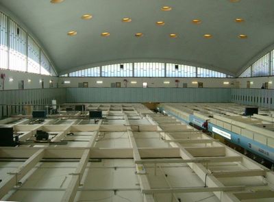 Het dak is een indrukwekkende betonnen schelpdakkon die zich zonder interne steunpilaren over de gehele ruimte uitstrekt en een van de grootste van Europa voorstelt. Deze buitengewone dunne betonnen schaalconstructie was een ingenieurskundig prestatie van zijn tijd en toont de geavanceerde technieken die in de jaren 1960 werden gebruikt.