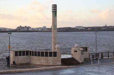 Het Liverpool Naval Memorial toont een cilindrische Portland-stenen zuil met glazen lantaarn op een halfcirkelvormig platform.