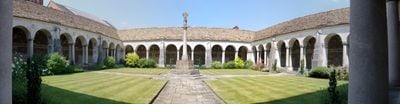 De Oorlogskloostergang toont een overdekte vierhoek gebouwd met gehouwen vuursteen, Portland steenblokken en rondbogen op Toscaanse zuilen.