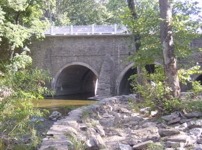 De constructie met drie overspanningen strekt zich 22 meter uit over de Pennypack Creek, met twee stenen bogen die het wegdek ondersteunen.