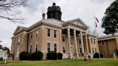 Het Halifax County Courthouse vertoont een lichtbruinen bakstenen structuur met een tetrastyle Korinthische portiek en tweeverdiepingsvleugels.