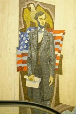 Gecreëerd in 1962 door kunstenaar Garo Z. Antreasian, het mozaïek toont vijf fasen uit Abraham Lincolns leven in Indiana tussen zijn 7e en 21e jaar.