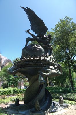 De Vredesfontein rijst 12 meter hoog op met de aartsengel Michael die Satan verslaat, omringd door dieren en hemellichamen.