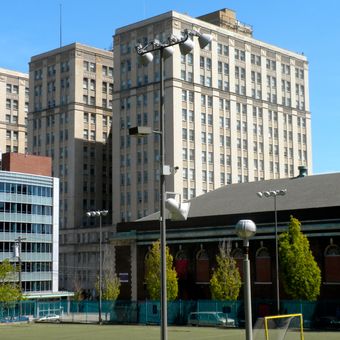 Het Pennsylvania Railroad kantoorgebouw toont klassieke architectonische elementen met een symmetrische gevel en steenwerk uit de vroege twintigste eeuw.